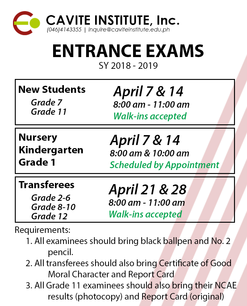 Entrance Exams and Assessments for new students and transferees this April 2018.
